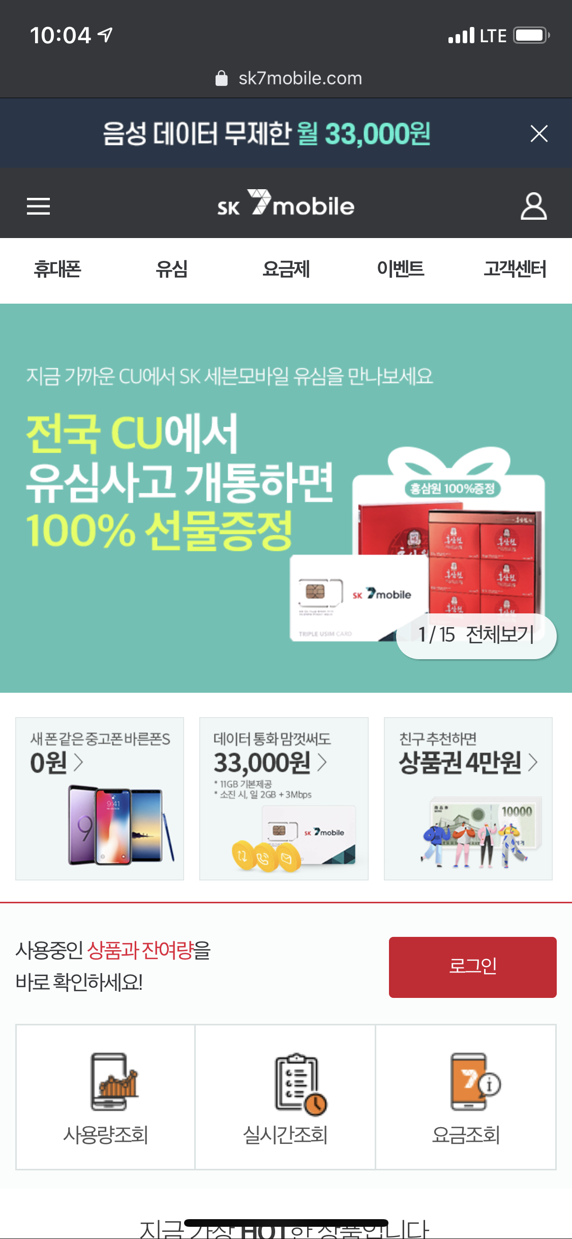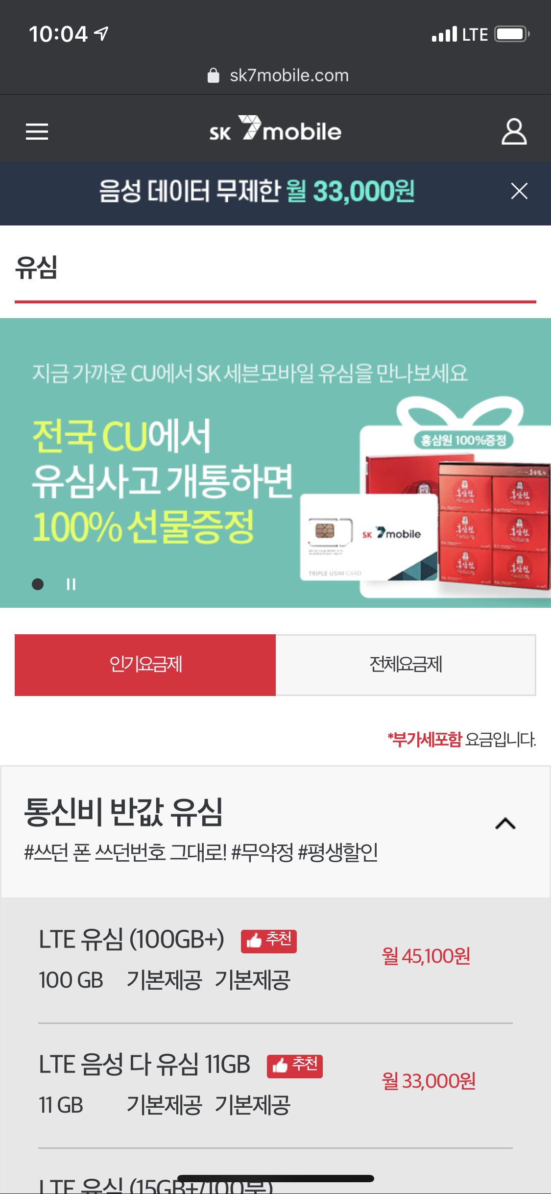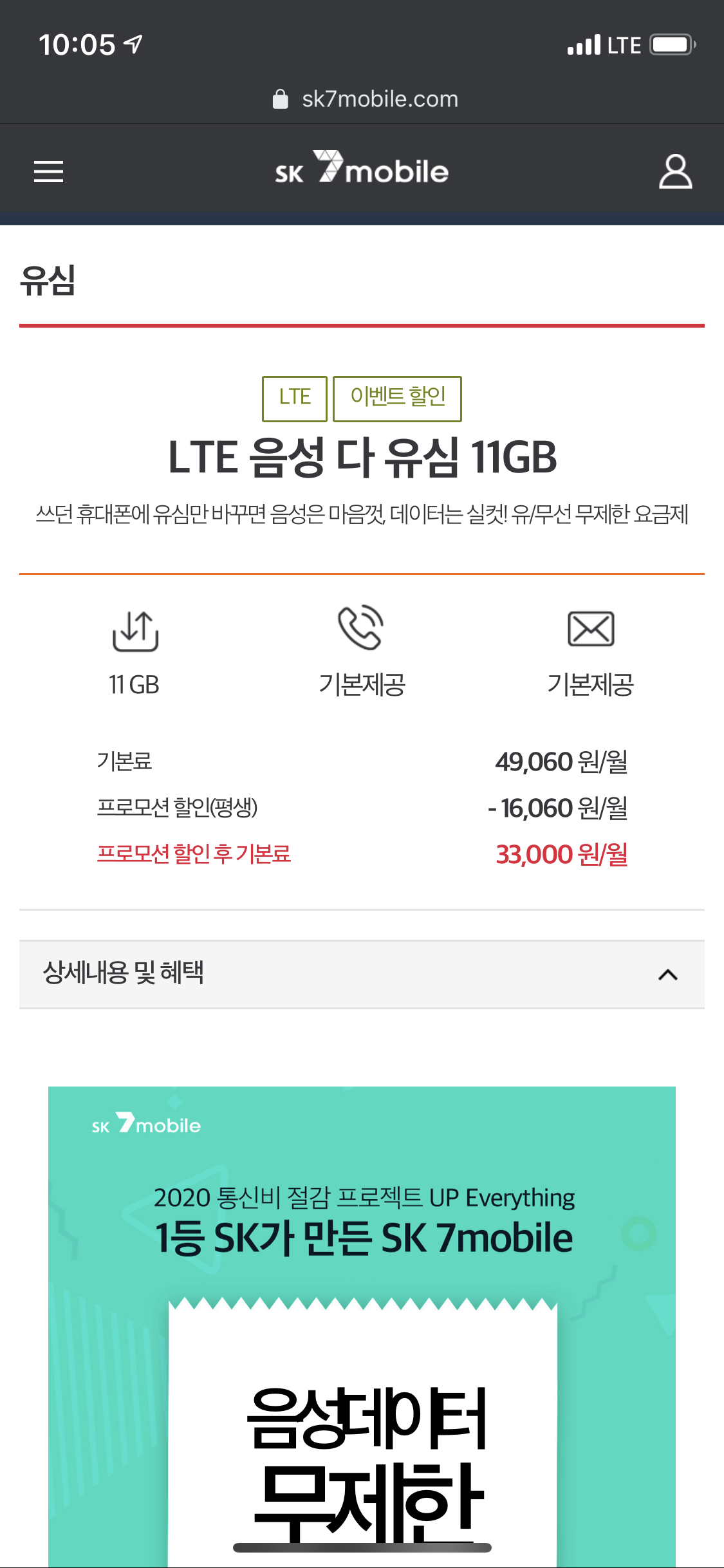 무제한을 이용하고 싶다. -> LTE 음성 다 유심 11GB(33,000)