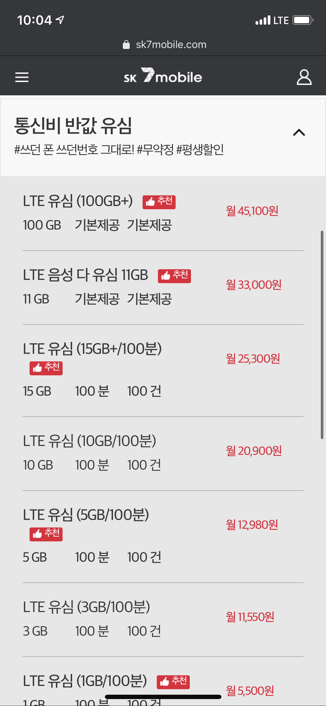 저는 LTE 음성 다 유심 11GB를