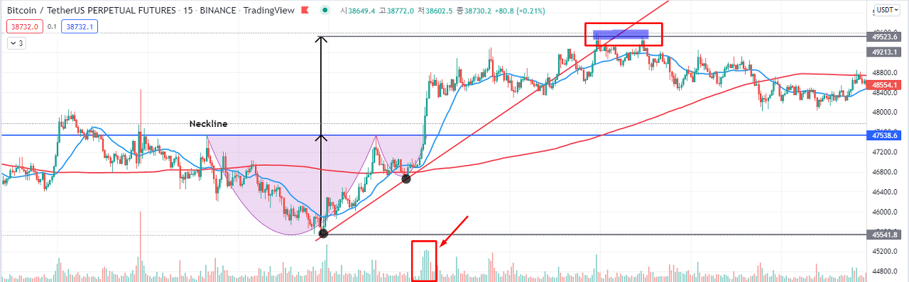 이런식으로 두개의 반원처럼 패턴화가 되며 하나의 큰반원 옆 작은 반원이 함께해 돌파 상승을 유도하는 패턴이다.