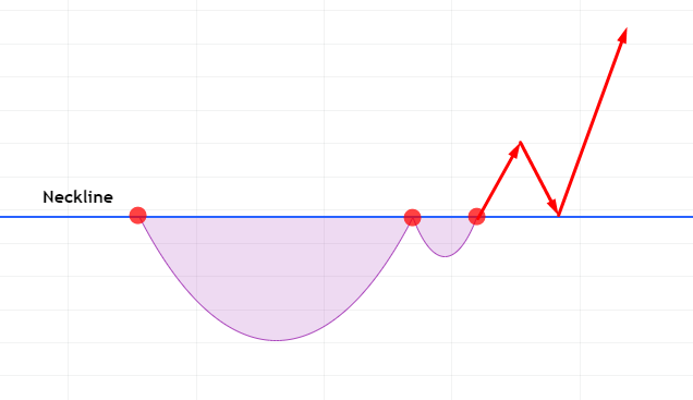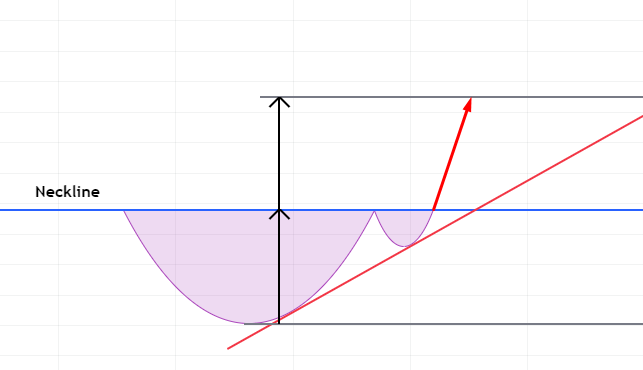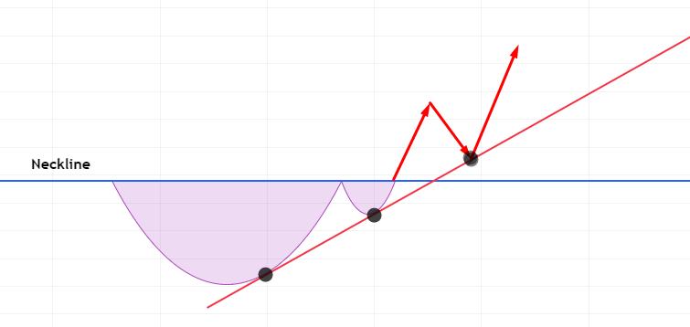 이때 컵앤핸들 패턴의 넥라인은 큰 반원의 지름 끝과 작은 반원의 지름 끝 총 3개의 점