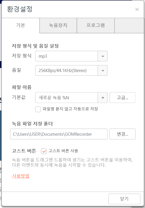 곰녹음기의 환경설정을 들어가면
