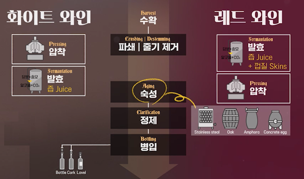 레드 와인: 수확 -> 압착 -> 침용(씨, 껍질 함께) -> 씨, 껍질 빼고 숙성 -> 병입 -> 정제