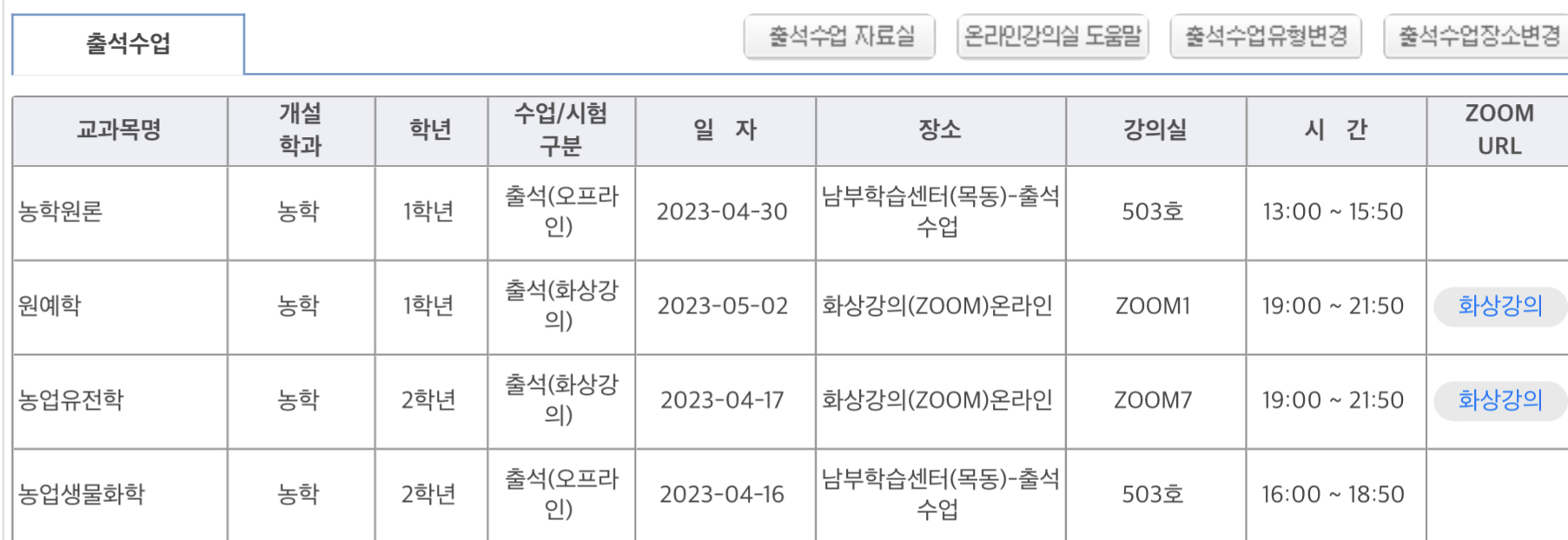 실제 출석 또는 줌으로 원격강의를 듣게 됩니다.