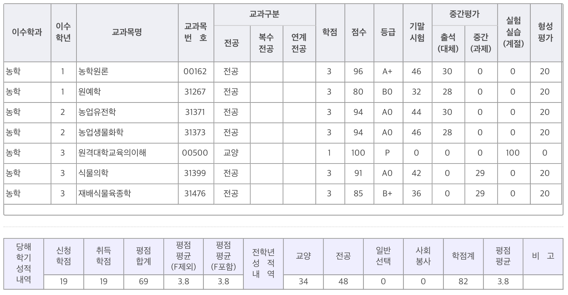 23학년도에 농학과 3학년 1학기를 마무리했고, 학점은 3.83으로 평점 3.8을 받았습니다(반올림)