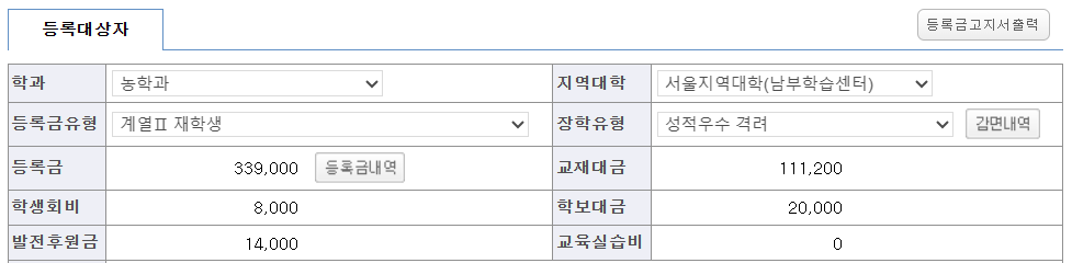 339,000원이 등록금이 되었습니다.